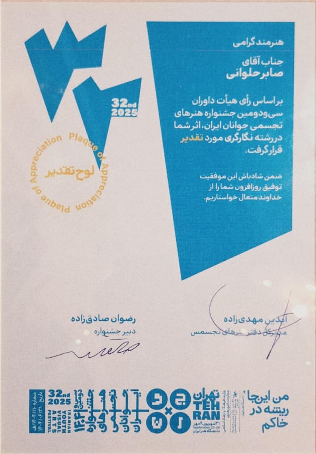 آقای صابر حلوانی دانشجوی کارشناسی ارشد نقاشی ایرانی دانشکده صنایع دستی در سی و دومین جشنواره هنرهای تجسمی جوانان ایران توانستند مقام دوم جشنواره را کسب نموده و مورد تقدیر قرار گرفتند. این موفقیت ارزشمند را به ایشان و همه دانشگاهیان دانشگاه هنر اصفهان تبریک عرض می نماییم.