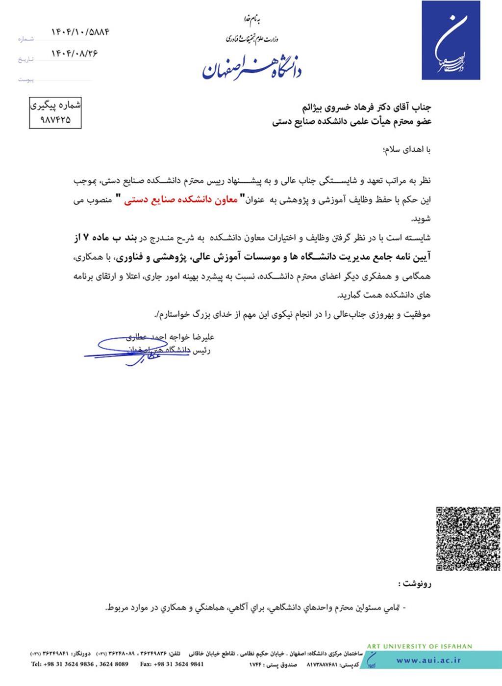 دکتر فرهاد خسروی بیژائم به عنوان معاون دانشکده صنایع دستی منصوب شد.