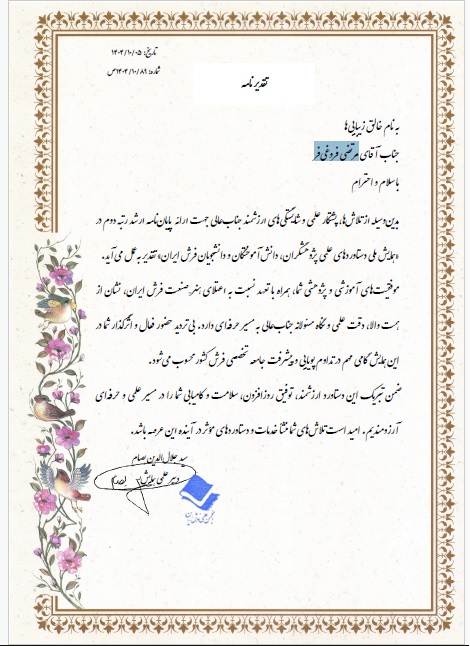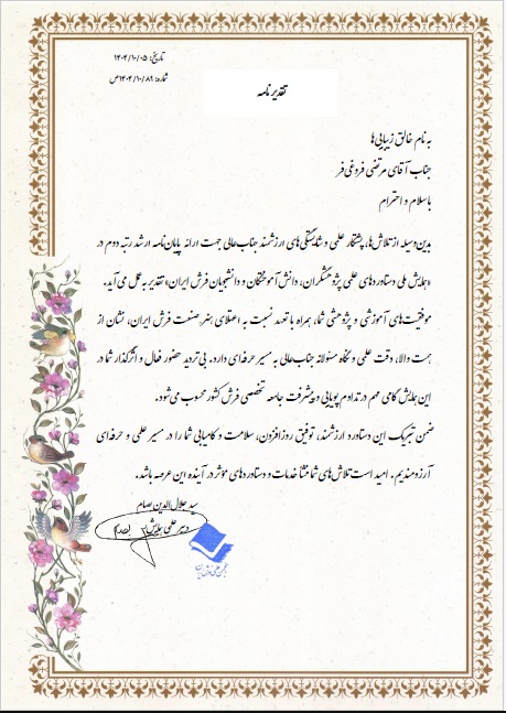 آقای مرتضی فروغی فر فارغ التحصیل کارشناسی ارشد فرش، در همایش ملی دستاوردهای علمی پژوهشگران، دانش آموختگان و دانشجویان فرش ایران موفق به کسب رتبه دوم گردید.