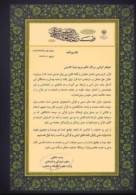 پایان نامه خانم مریم ضیاء الدینی، فارغ التحصیل کارشناسی ارشد فرش به راهنمایی دکتر فرهاد باباجمالی در بیست و دومین جشنواره ملی پایان نامه های دینی و قرآنی موفق به کسب رتبه اول کشوری گردید.