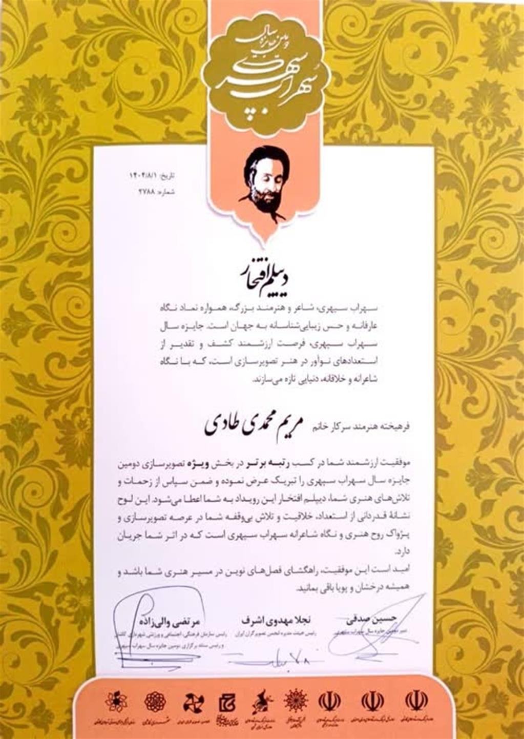 کسب رتبه برتر توسط خانم مریم محمدی طادی، دانشآموخته نقاشی دانشگاه هنر اصفهان در بخش ویژه دومین دوره جایزه ملی سهراب سپهری